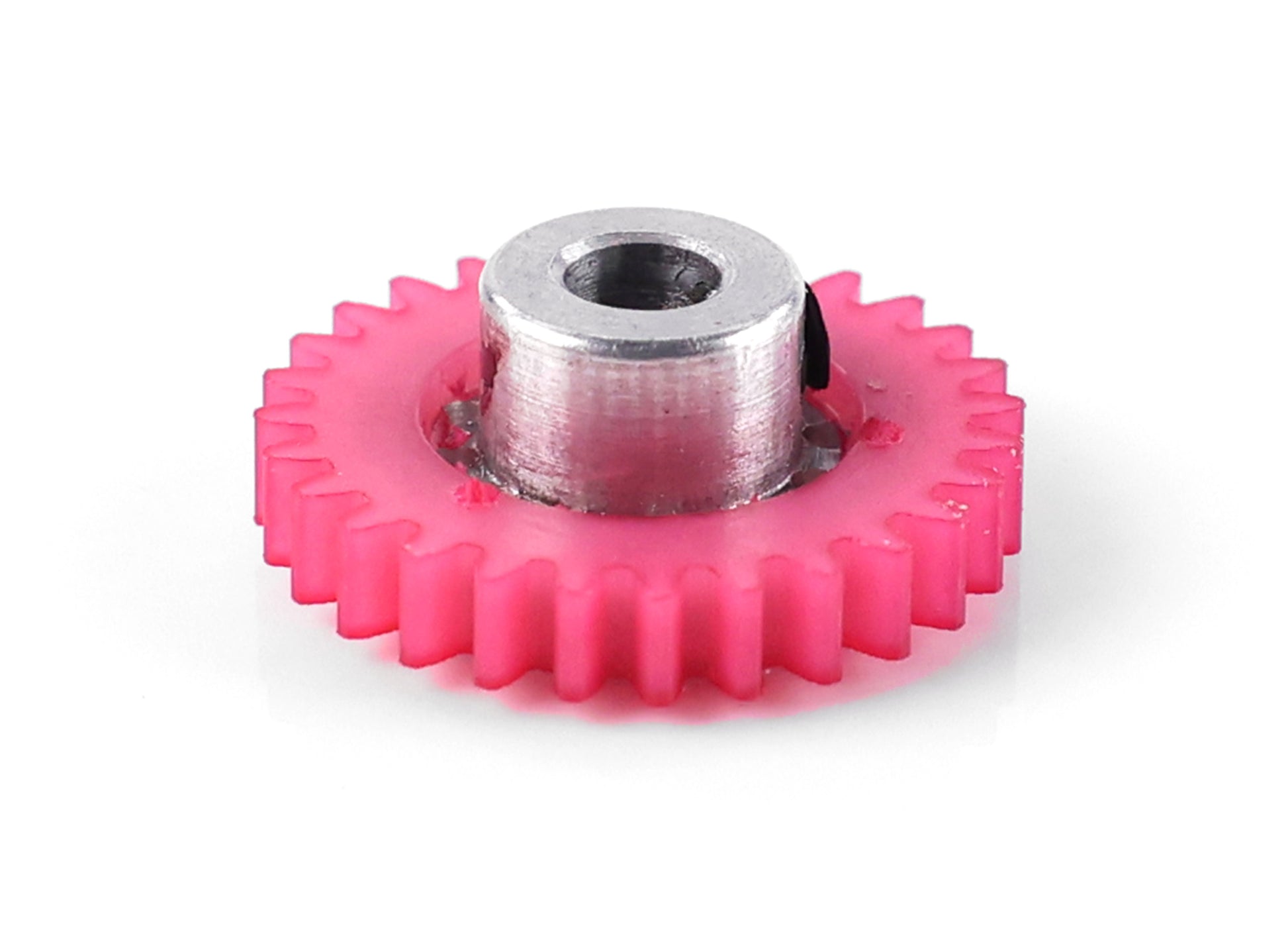 The Slick 7 hybrid gears use a big diameter hub, which provides a thinner plastic gear ring. This makes the teeth stiffer and the plastic less prone to flaws, resulting in a more reliable gear that transfers power more efficiently. Stiffer gears with less flex improves power transfer so more energy goes to propel the car.