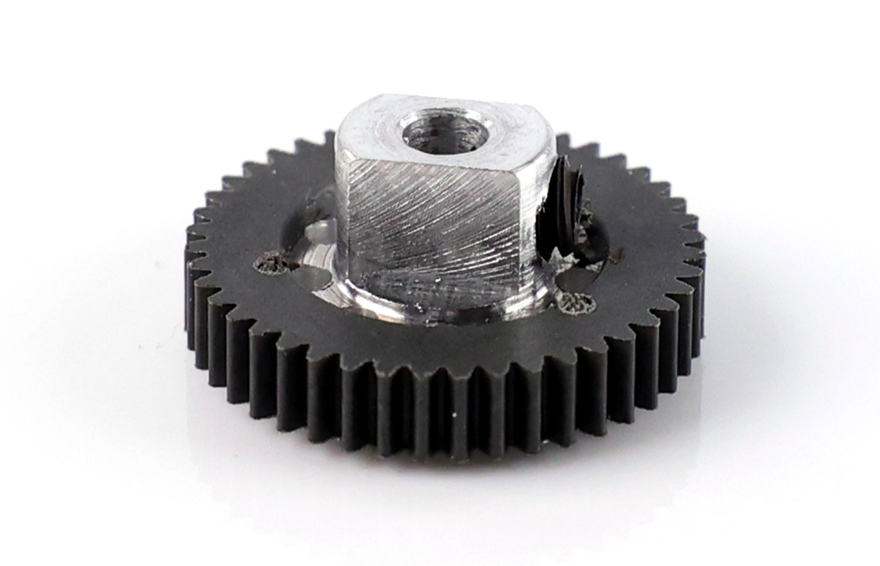 The Slick 7 hybrid gears use a big diameter hub, which provides a thinner plastic gear ring. This makes the teeth stiffer and the plastic less prone to flaws, resulting in a more reliable gear that transfers power more efficiently. Stiffer gears with less flex improves power transfer so more energy goes to propel the car.