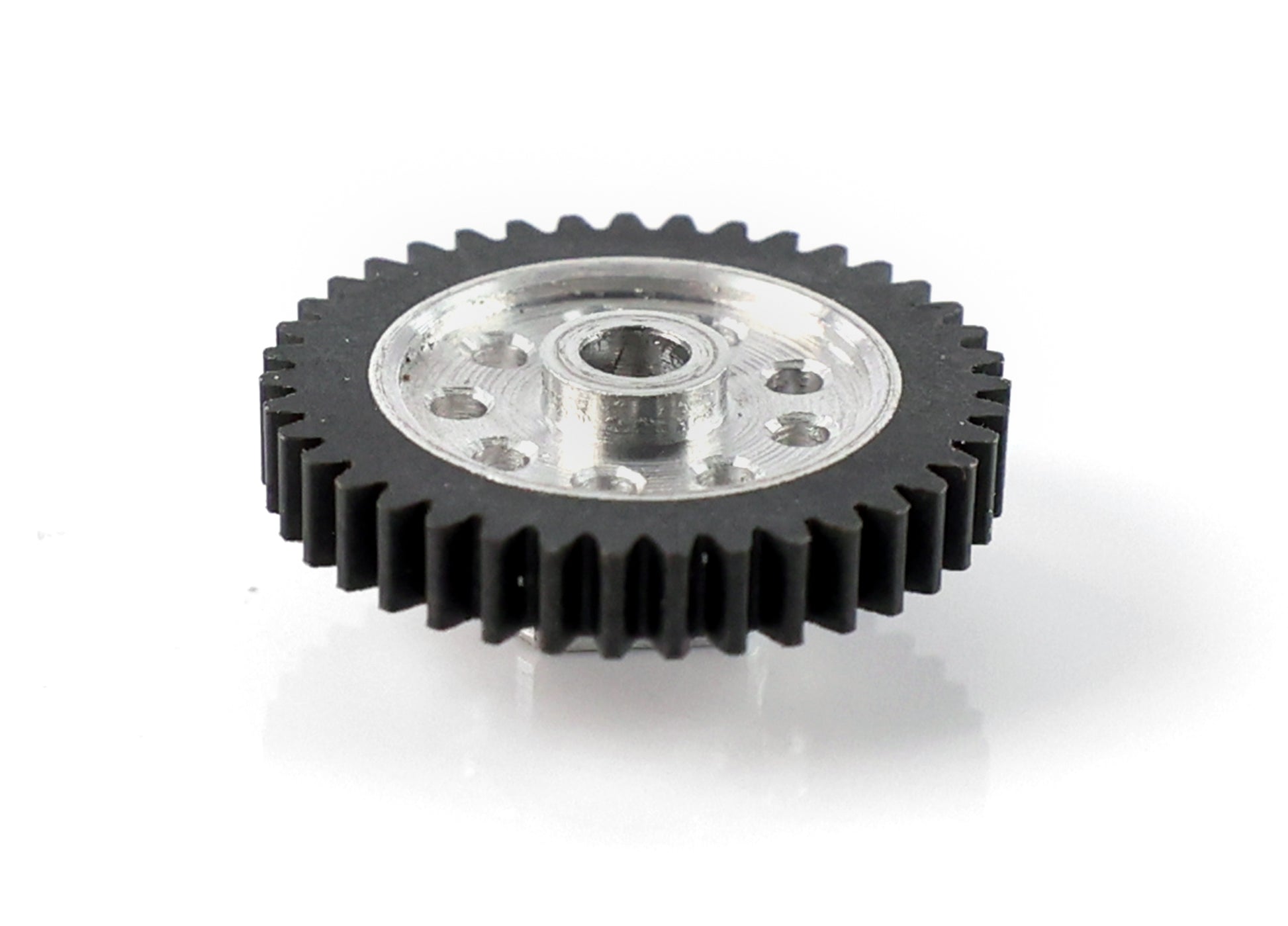The Slick 7 hybrid gears use a big diameter hub, which provides a thinner plastic gear ring. This makes the teeth stiffer and the plastic less prone to flaws, resulting in a more reliable gear that transfers power more efficiently. Stiffer gears with less flex improves power transfer so more energy goes to propel the car.